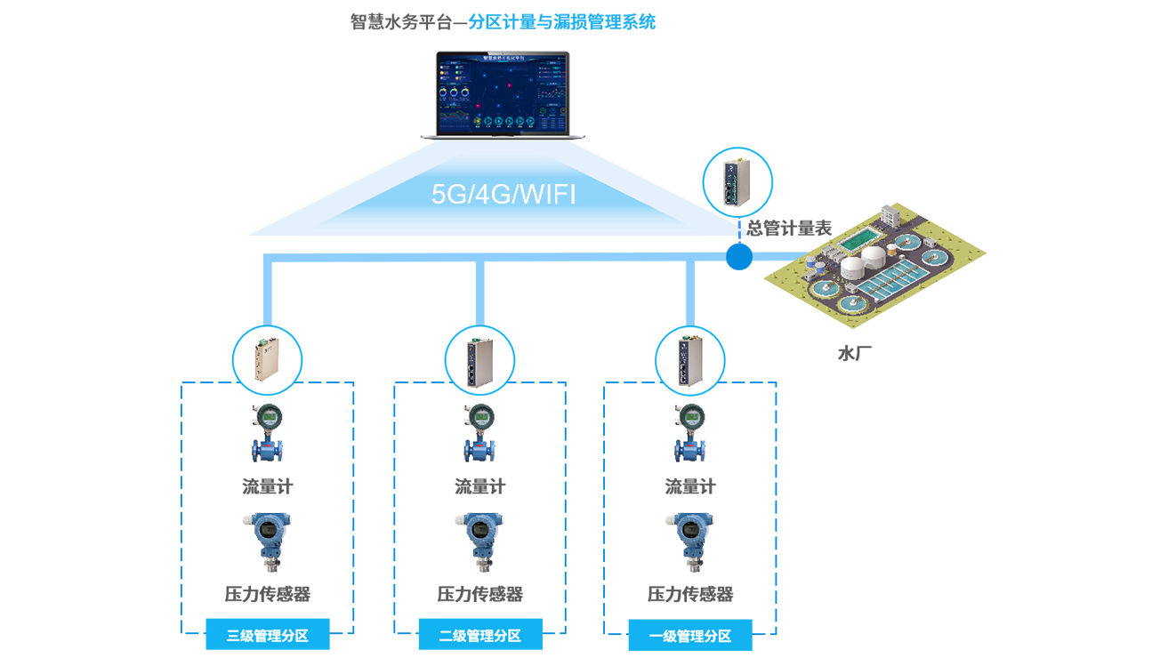將供水管網(wǎng)劃分為多個 DMA 分區(qū),在每個分區(qū)的進出口安裝流量傳感器和壓力傳感器,通過物通博聯(lián)的工業(yè)智能網(wǎng)關將采集到的流量和壓力數(shù)據(jù)實時傳輸至 DMA 分區(qū)計量漏損監(jiān)測平臺。平臺對數(shù)據(jù)進行實時分析和處理,通過建立數(shù)學模型和算法對漏損情況進行分析和判斷,精準定位漏損點。同時,平臺具備分區(qū)計量管理功能,可對各分區(qū)的用水情況進行統(tǒng)計和分析,為維修決策提供支持。