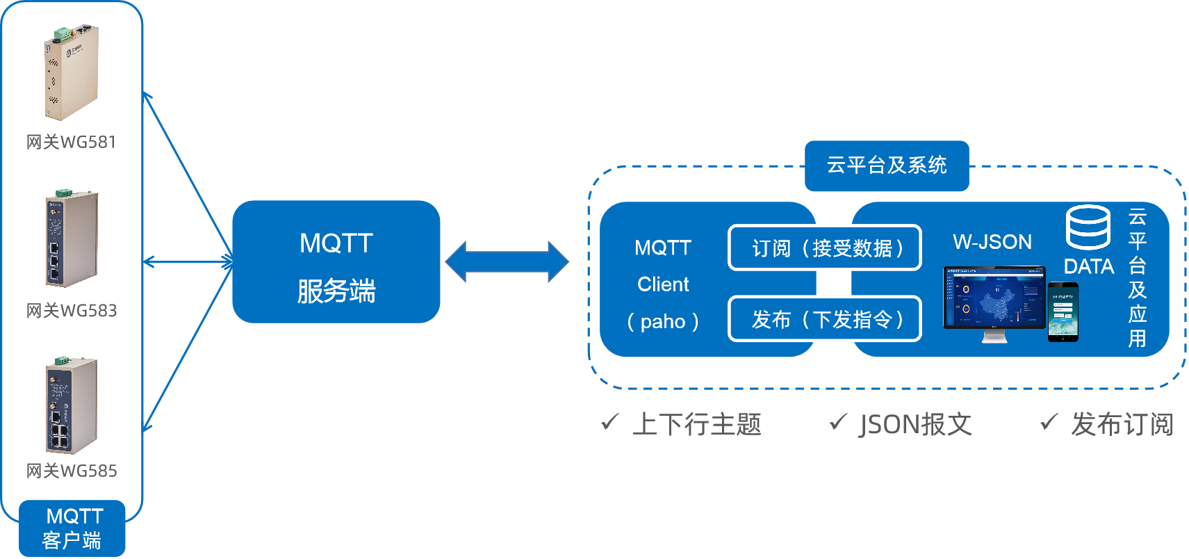 物通博聯(lián)工業(yè)智能網(wǎng)關采集各種工控設備(PLC、采集器、儀器儀表和傳感器)的數(shù)據(jù)并在邊緣節(jié)點進行數(shù)據(jù)過濾、運算和標準化后,通過MQTT物聯(lián)網(wǎng)協(xié)議以W-JSON字符串格式將數(shù)據(jù)上報到云端平臺,或者接受云端下發(fā)的JSON控制指令進而控制現(xiàn)場設備,從而實現(xiàn)云端和現(xiàn)場設備的數(shù)據(jù)交互。