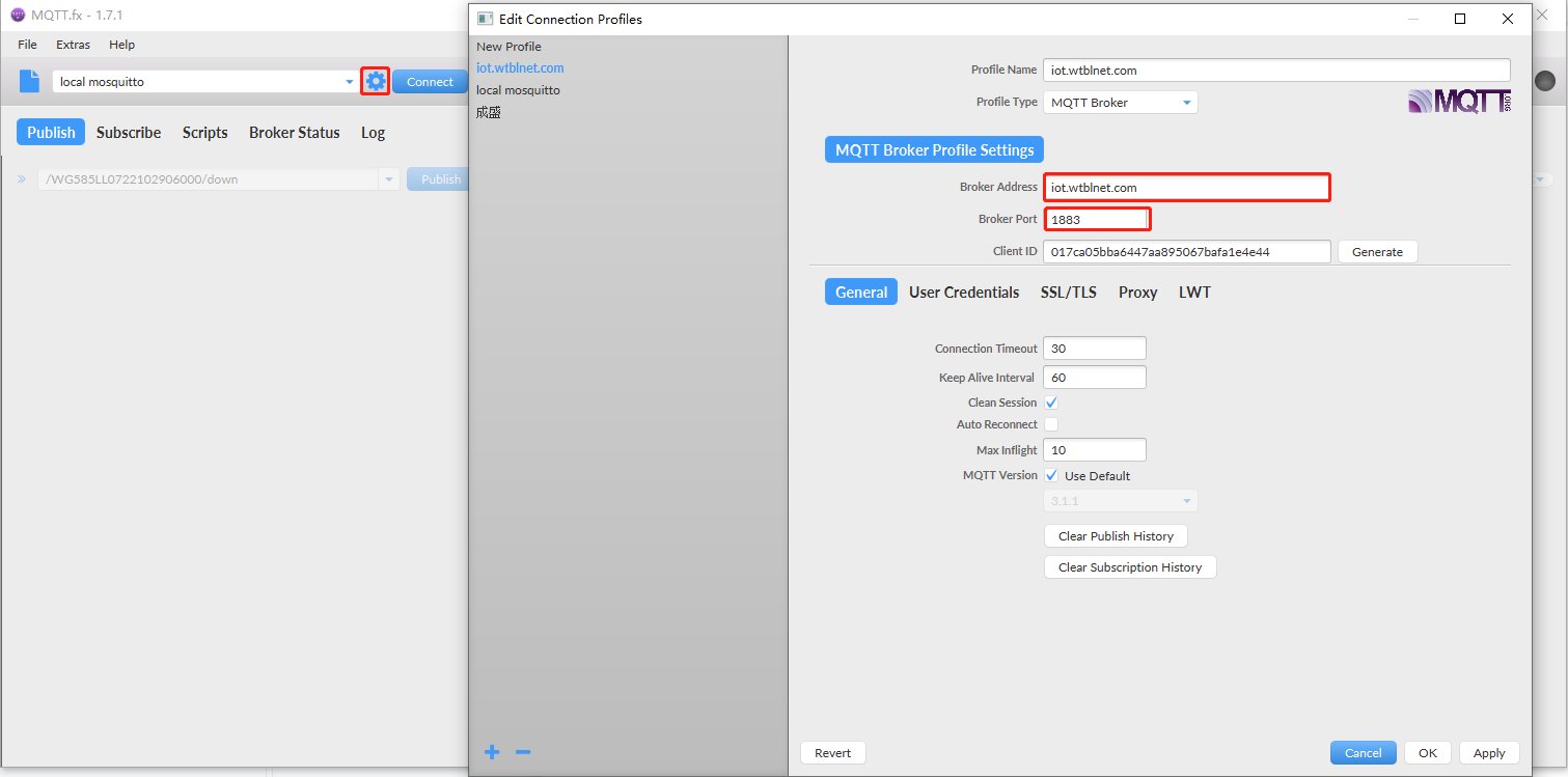 電腦安裝“mqtt.fx”客戶端,設置服務器地址和端口。