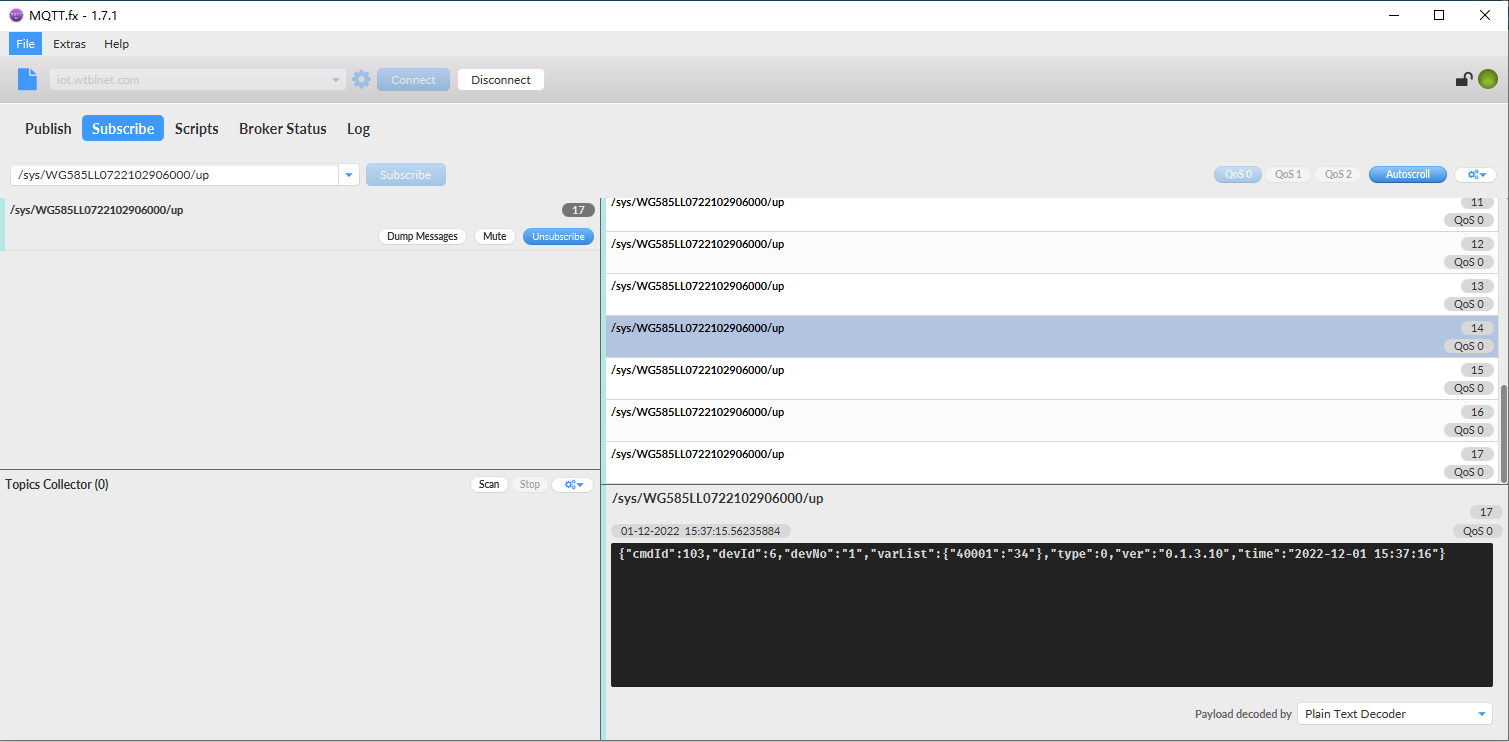 物通博聯(lián)網(wǎng)關的上行主題為/sys/$gatewaySn/up,下行主題為/$gatewaySn/down。
