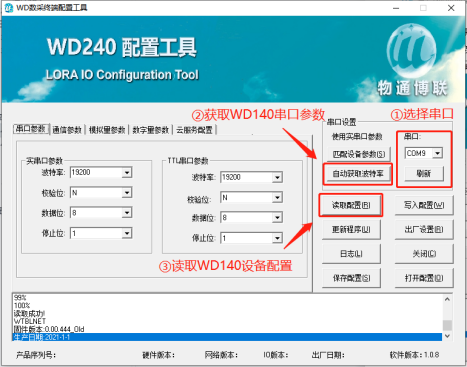 打開配置工具,選擇相應的串口,點擊“自動獲取波特率”,獲取成功后點擊“讀取配置”。