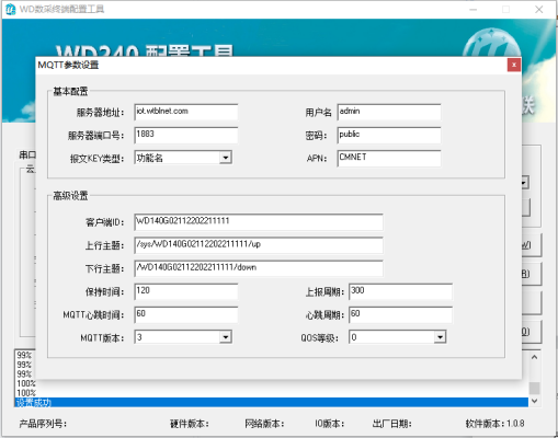 設置好基本參數后,點擊“MQTT配置”,配置MQTT服務器的IP地址,端口以及上下行主題(Topic)等參數,如下圖: