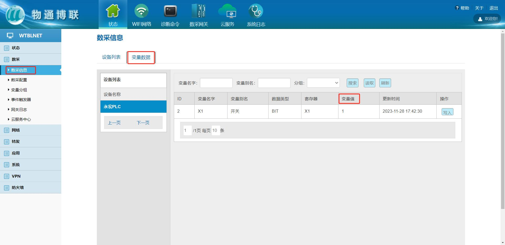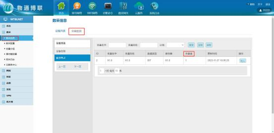 等待右下角彈出成功提示框后,點擊“數(shù)采信息”->“變量數(shù)據(jù)”,即可在“變量值”一列查看采集結果。