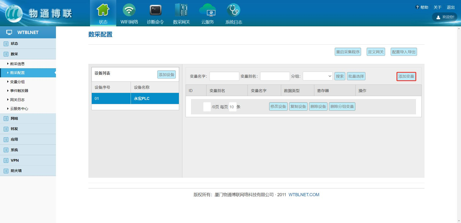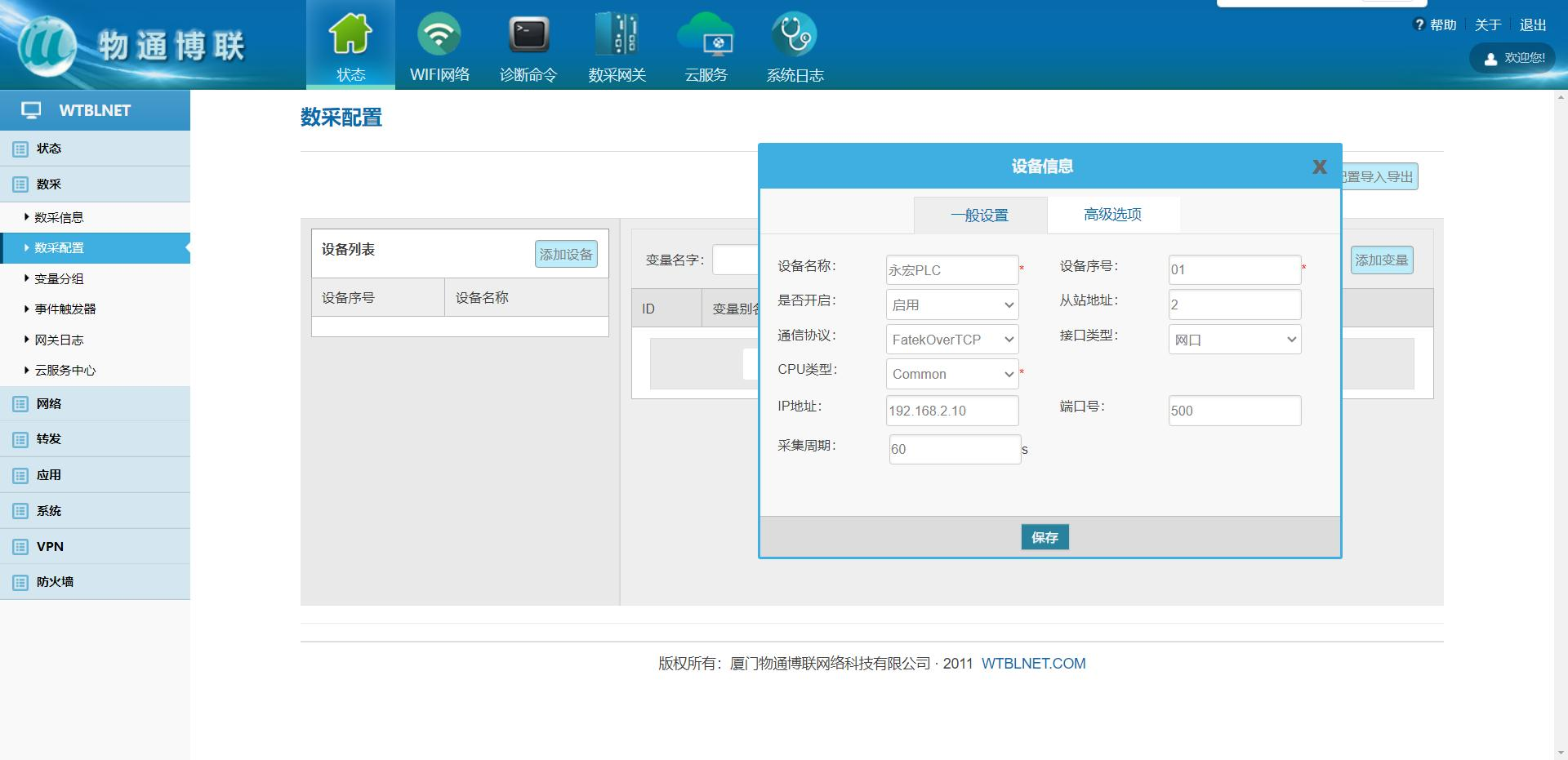 登錄網(wǎng)關管理界面,點擊數(shù)采->數(shù)采配置->添加設備。