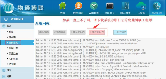 如果通過如上設置還是沒辦法上網,請下載診斷日志,然后發給物通博聯工程師;我們工程師會根據系統日志診斷問題并提出指導建議。