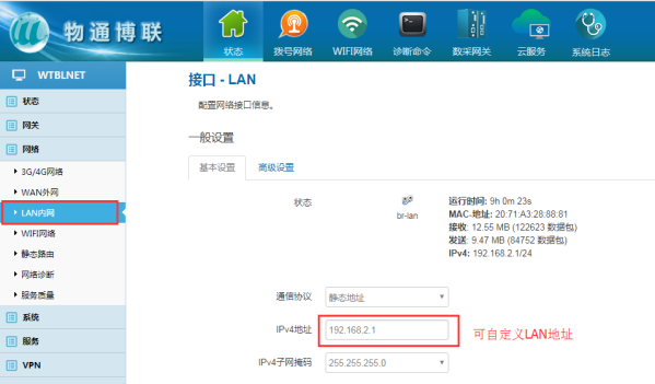 網關LAN以太網地址可自定義,但WAN以太網地址和LAN以太網地址不能同一個網段。