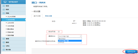 勾選自動開啟,選擇通信協議(靜態地址、DHCP客戶端、PPPOE,三選一),保存&應用。