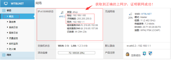 P.s.驗證網關已聯網情況:狀態-概率-網絡-IPV4WAN狀態---獲取到IP地址