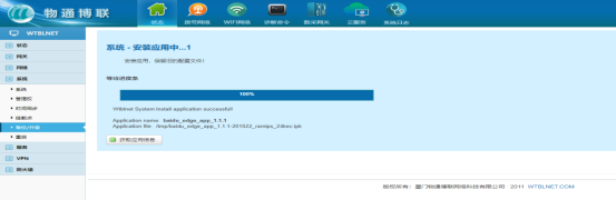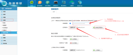 進(jìn)入系統(tǒng)→備份升級,輸入升級密碼:wtbl1234567890@wtblnet.com ,然后選擇對應(yīng)要升級的ipk,最后點擊安裝,進(jìn)度條顯示100%即完成操作。
