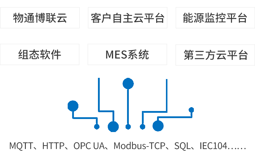 北向支持接入物通博聯(lián)云平臺(tái),客戶自主開(kāi)發(fā)的云平臺(tái),第三方云平臺(tái)(根云、美云、華為、阿里、百度、微軟等IOT云平臺(tái)),能源監(jiān)控平臺(tái)等