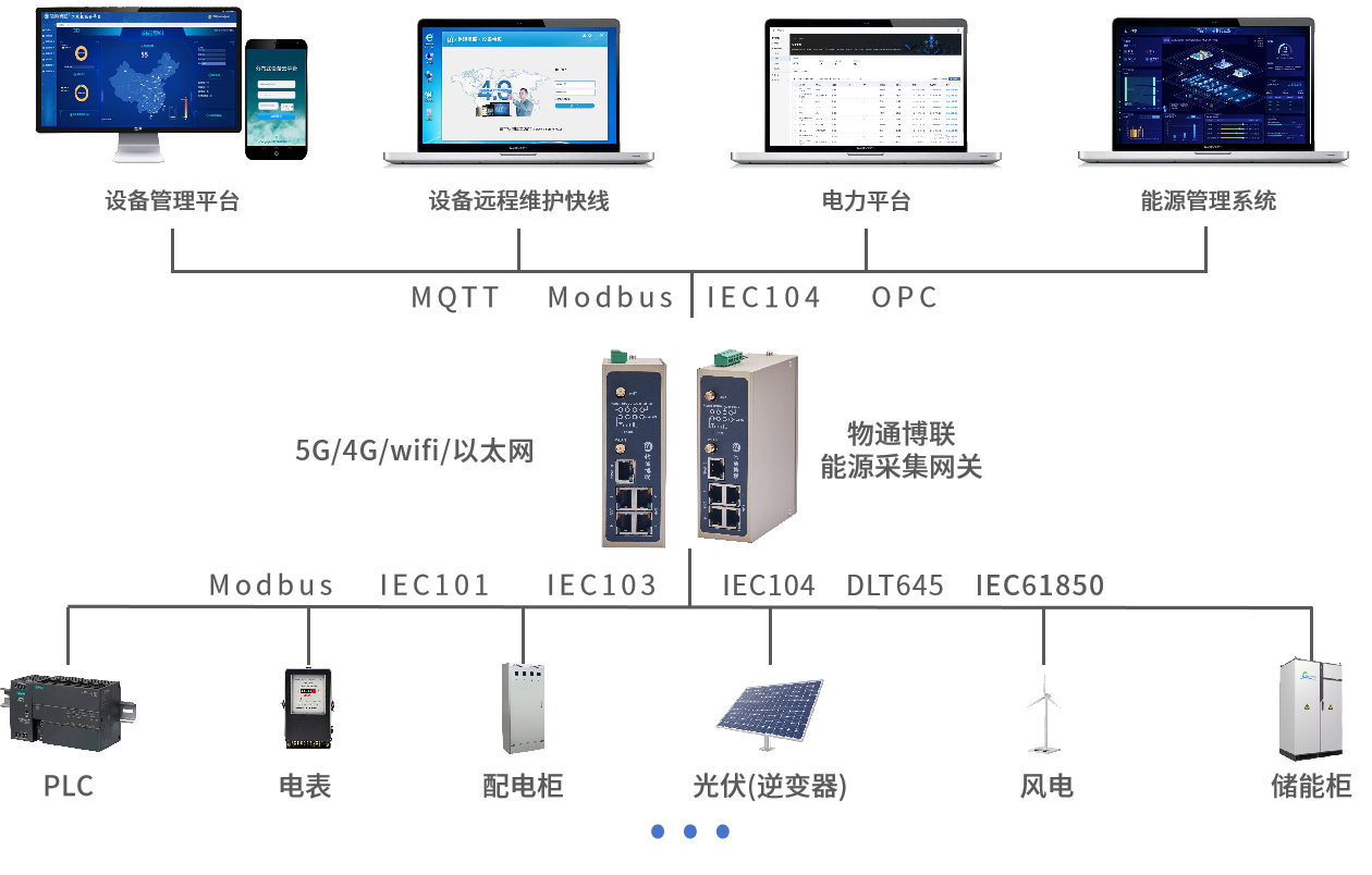 物通博聯(lián)能源采集網(wǎng)關(guān)可以連接水、電、氣、熱等能源設(shè)備和PLC,支持Modbus、IEC101、IEC103、IEC104、DLT645、IEC61850等協(xié)議,采集能源數(shù)據(jù)上傳到能源管理系統(tǒng)或數(shù)據(jù)中心進(jìn)行分析和監(jiān)控,實(shí)時(shí)監(jiān)控各種能源設(shè)備的運(yùn)行狀態(tài)和能源消耗情況,及時(shí)發(fā)現(xiàn)和解決能源浪費(fèi)和設(shè)備故障等問(wèn)題,提高能源管理效率。