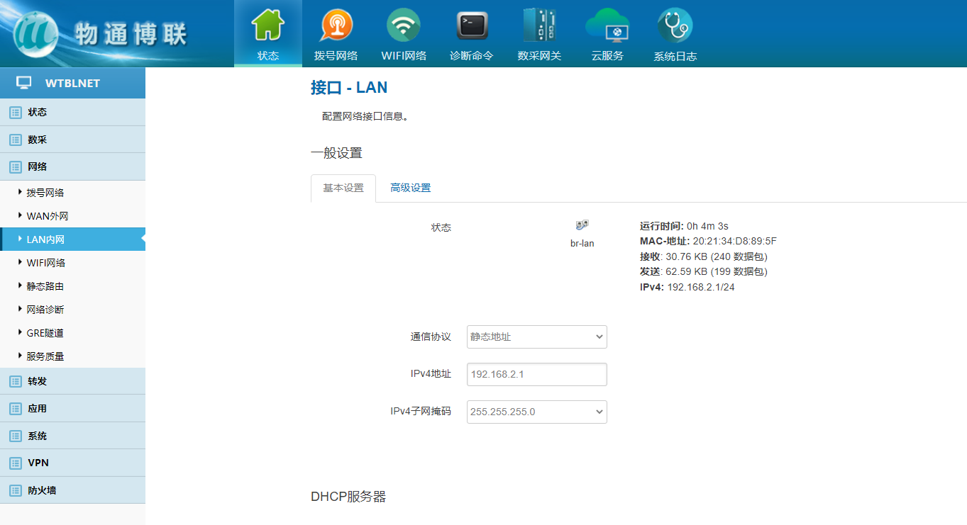 下載中心 視頻中心 常見問題 售后服務 工業網關 設備快線 數據云平臺 聯網設備 問答百科 如何修改工業智能網關的LAN口IP地址? 時間:2022-10-26 09:06:09 點擊:4713 關鍵詞:工業智能網關,LAN口 問題:如何修改工業智能網關的LAN口IP地址? 回答: (1)電腦直連網關,確保電腦與網關處于同網段或者自動獲取 瀏覽器里面輸入192.168.2.1 (2)登陸網關配置界面 默認用戶名/密碼:admin/123456 (2)選擇網絡——Lan內網——更改IPV4地址、子網掩碼,保存應用 (3)注意電腦本機IP地址是否與更改地址處于同網段(自動獲取需重新拔 插網線) (4)瀏覽器輸入更改后的IP地址登陸到網關配置界面即修改成功 上一篇:工業智能網關和DTU有什么區別嗎? 下一篇: 工業智能網關需要另外配4G路由器嗎?