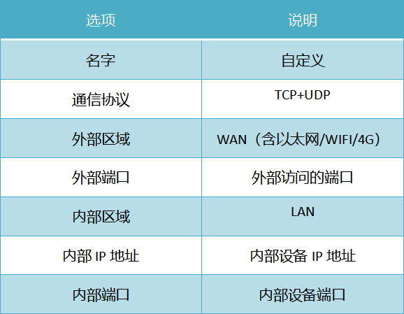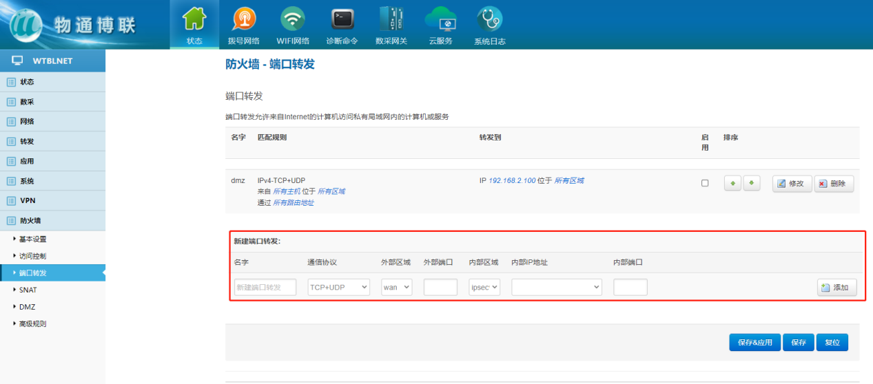 下載中心 視頻中心 常見問題 售后服務 工業(yè)網(wǎng)關 設備快線 數(shù)據(jù)云平臺 聯(lián)網(wǎng)設備 問答百科 工業(yè)網(wǎng)關如何配置端口映射? 時間:2022-10-26 09:39:53 點擊:4886 關鍵詞:工業(yè)網(wǎng)關,網(wǎng)關配置,端口轉發(fā) 問題:工業(yè)網(wǎng)關如何配置端口映射? 回答: 網(wǎng)關配置界面—防火墻—端口轉發(fā) 端口轉發(fā)允許來自Internet的計算機訪問私有局域網(wǎng)內的計算機或服務 使用場景:端口轉發(fā)是將發(fā)往外網(wǎng)的一個端口的通信完全轉發(fā)給內網(wǎng)一個地址的指定端口 上一篇:如何通過物通博聯(lián)工業(yè)網(wǎng)關實現(xiàn)網(wǎng)口設備遠程上下載? 下一篇: 工業(yè)智能網(wǎng)關支持的電壓范圍?