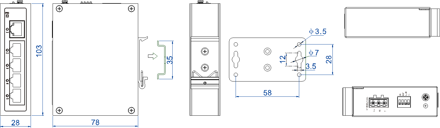 外殼:IP40防護(hù)等級,金屬外殼 安裝:DIN導(dǎo)軌式或壁掛式安裝 尺寸(寬×高×深):28mm×103mm×78mm |