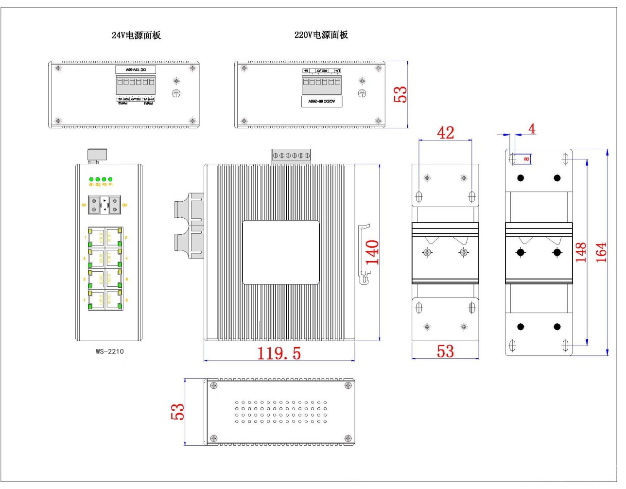 8個10/100/1000Base-T(X)自適應以太網(wǎng)RJ45接口 2個1000M SFP擴展槽 |