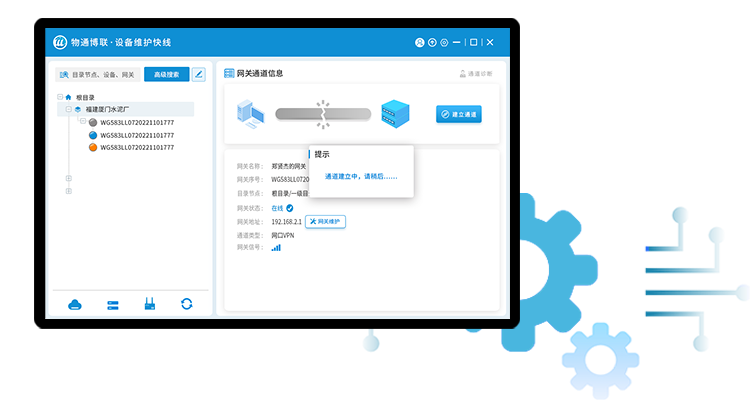 使用物通博聯的設備維護快線,通過賬號登錄后,找到相應網關建立維護通道,就可以搭建通往設備現場的網口通道和串口通道,讓工程師不用遠程出差就可以像到現場一樣,實現隨時隨地遠程維護。