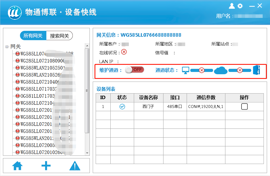 選擇選擇一臺需要維護的在線網關,點擊建立通道,等到通道狀態都是綠色打鉤后就證明通道建立完成,以太網設備可以通過ping來測試通道情況。