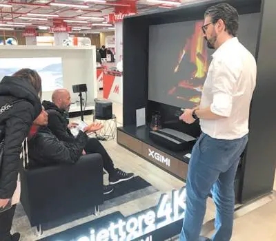 消費者在極米科技位于意大利米蘭一家電器商場的快閃店體驗投影儀產品。 鄒 成攝