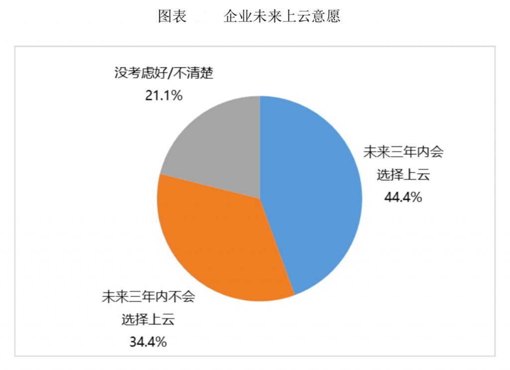 在沒有選用云服務(wù)的企業(yè)用戶中,超越40%的企業(yè)計劃在未來三年內(nèi)開端選用云服務(wù)模式,未上云企業(yè)依然存在比較強 的上云志愿,全體來看,我國企業(yè)事務(wù)上云還處于起步階段,未來的商場潛力巨大。