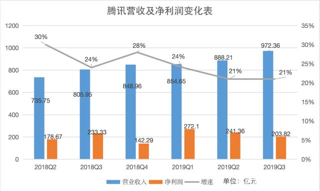 騰訊財(cái)報(bào)顯示,2019年第三季度營收972億元,同比增長20.6%,低于市場預(yù)期的990.4億元,增速與上季度持平;第三季度,公司股東應(yīng)占利潤,即凈利潤203億元,同比下降13%,低于市場預(yù)期的235.3億元。