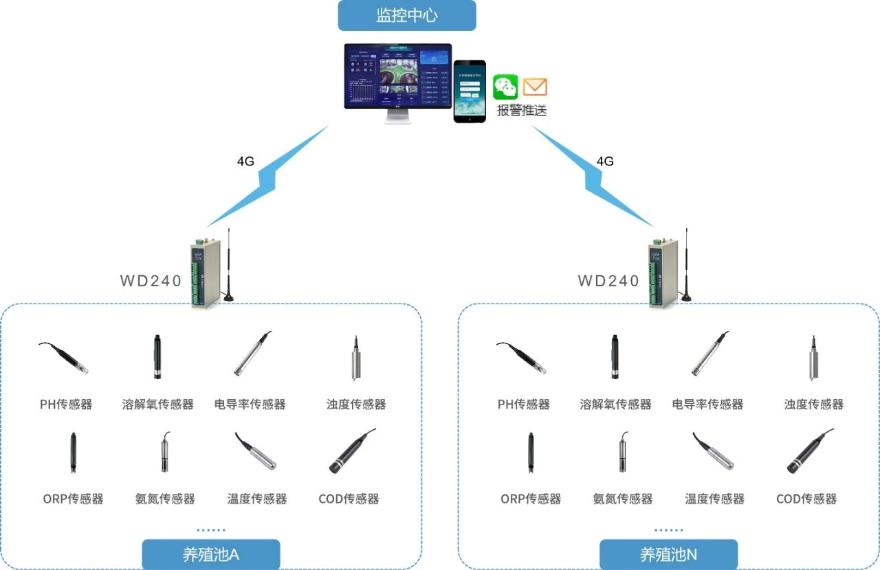 4、遠程控制:出現異常自動告警,并能設置增氧機、水泵等控制指令,保證水中的含氧活性,提高工作效率與管理水平。