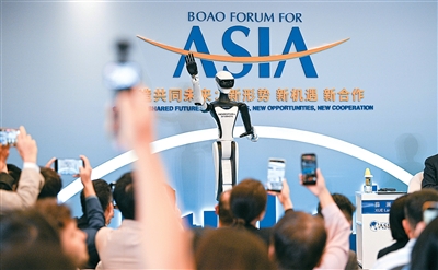 博鰲亞洲論壇二〇二六年年會期間,多元智能設備全方位護航盛會運行,以科技力量賦能智慧辦會。圖為在年會分論壇上參與互動的人形機器人。新華社記者 蒲曉旭攝