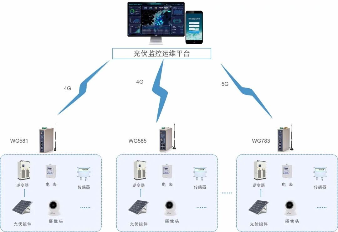 某企業運營的多個光伏電站分布在多個省份和地區,距離較遠、分布較散,人工抄錄數據的方式存在成本高、效率低等問題,同時并網數據也不能快速統計查看,十分影響工作效率與運營水平?,F需要將光伏電站數據采集到物聯網平臺中,涉及數采的設備包含光伏發電表、光伏逆變器、箱變測控終端等,實現集中監控與管理。