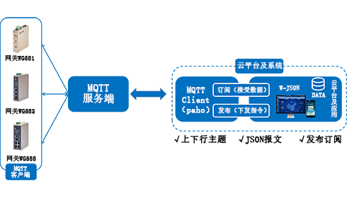 網關內嵌MQTT客戶端,它建立與部署在服務器上的MQTT Broker的雙向通信鏈路;同時客戶自行開發(fā)的云平臺(或本地軟件)也是通過MQTT客戶端來和MQTT Broker來實現(xiàn)訂閱和發(fā)布數(shù)據(jù)的雙向通信。